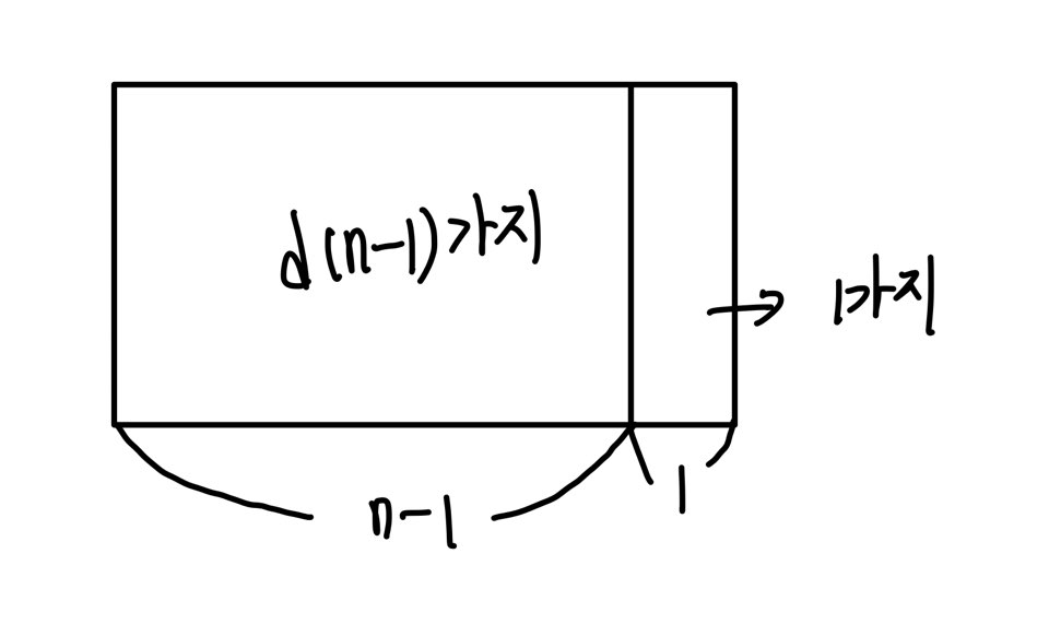 위와 같은 경우, 이미 이전에 d(n-1)가짓 수로 타일을 배치한 상태에서 1가지의 방법으로 밖에 타일을 놓지 못한다.