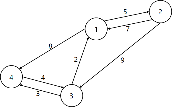 #include <iostream> #define INF 1e9 using namespace std; int number = 4; int a[4][4] = { {0, 5, INF, 8}, {7, 0, 9, INF}, {2, INF, 0, 4}, {INF, INF, 3, 0} }; void floyd() { int result[4][4]; // 결과값을 담는 배열 result를 초기화 for (int i = 0; i < 4; i++) { for (int j = 0; j < 4; j++) { result[i][j] = a[i][j]; } } for (int k = 0; k < number; k++) { for (int i = 0; i < number; i++) { for (int j = 0; j < number; j++) { if (result[i][k] + result[k][j] < result[i][j]) { result[i][j] = result[i][k] + result[k][j]; } } } } for (int i = 0; i < number; i++) { for (int j = 0; j < number; j++) { printf("%2d ", result[i][j]); } printf("\n"); } } int main() { floyd(); return 0; }