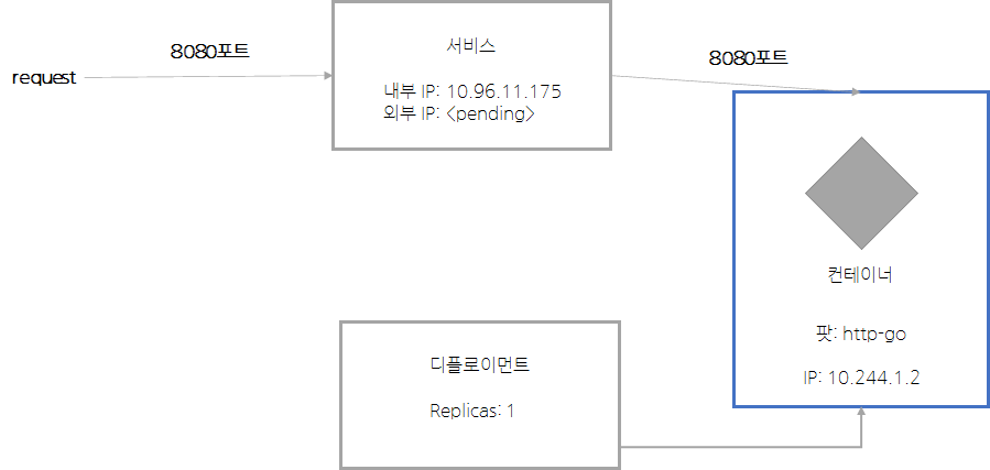 클라이언트는 팟에 직접 연결을 하는 것이 아니라 서비스에 연결을 한 후 서비스는 팟 중 하나로 연결을 포워딩 해줍니다.