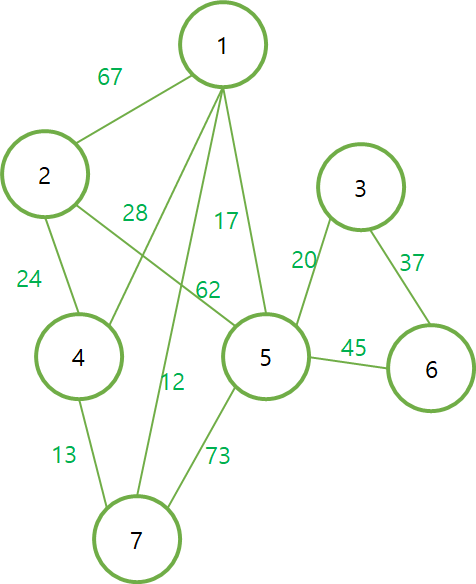 #include <iostream> #include <algorithm> #include <vector> using namespace std; int parent[8]; class Edge { public: int node[2]; int dis; Edge(int a, int b, int dis) { this->node[0] = a; this->node[1] = b; this->dis = dis; } // operator를 사용하여 dis가 작은 순서대로 sort가 되도록 함 bool operator <(Edge & edge) { return this->dis < edge.dis; } }; // 부모를 찾는 함수 (재귀 사용) int get_parent(int parent[], int n) { int result = 0; if (parent[n] == n) return n; return result = get_parent(parent, parent[n]); } // 두 노드의 부모를 합치는 함수 void union_parent(int parent[], int a, int b) { int p_a = get_parent(parent, a); int p_b = get_parent(parent, b); if (p_a < p_b) { parent[b] = a; } else { parent[a] = b; } } // 두 노드의 부모가 같은지 확인하는 함수 int is_Union(int parent[], int a, int b) { int p_a = get_parent(parent, a); int p_b = get_parent(parent, b); if (p_a == p_b) { return 1; } else return 0; } int main() { vector<Edge> v; // 노드 사이의 간선을 생성한다. v.push_back(Edge(1, 7, 12)); v.push_back(Edge(7, 4, 13)); v.push_back(Edge(4, 2, 24)); v.push_back(Edge(1, 5, 17)); v.push_back(Edge(1, 4, 28)); v.push_back(Edge(1, 2, 67)); v.push_back(Edge(5, 2, 62)); v.push_back(Edge(5, 3, 20)); v.push_back(Edge(5, 6, 45)); v.push_back(Edge(3, 6, 37)); v.push_back(Edge(5, 7, 73)); sort(v.begin(), v.end()); int sum = 0; for (int i = 1; i <= 7; i++) { parent[i] = i; } for (int i = 0; i < v.size(); i++) { if (!is_Union(parent, v[i].node[0], v[i].node[1])) { // 두 노드가 같은 부모를 가지고 있지 않을 경우에만 간선 추가 union_parent(parent, v[i].node[0], v[i].node[1]); sum += v[i].dis; } } printf("최소비용 = %d", sum); }